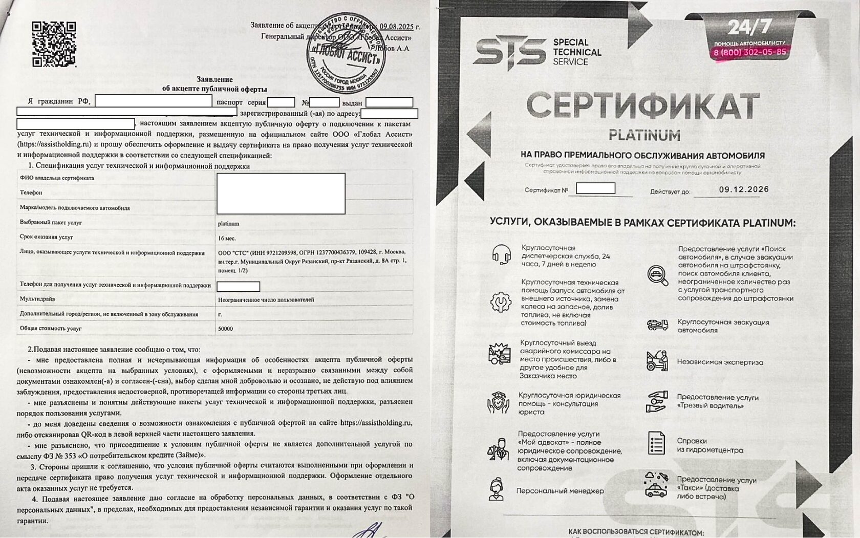 Услуга оформляется путем подписания Заявление об акцепте публичной оферты от ООО «Глобал Ассист». За данный комплекс мой клиент заплатил 50 000 рублей. Вместе с заявлением в пакете документов выдается Сертификат STS на право премиального обслуживания.