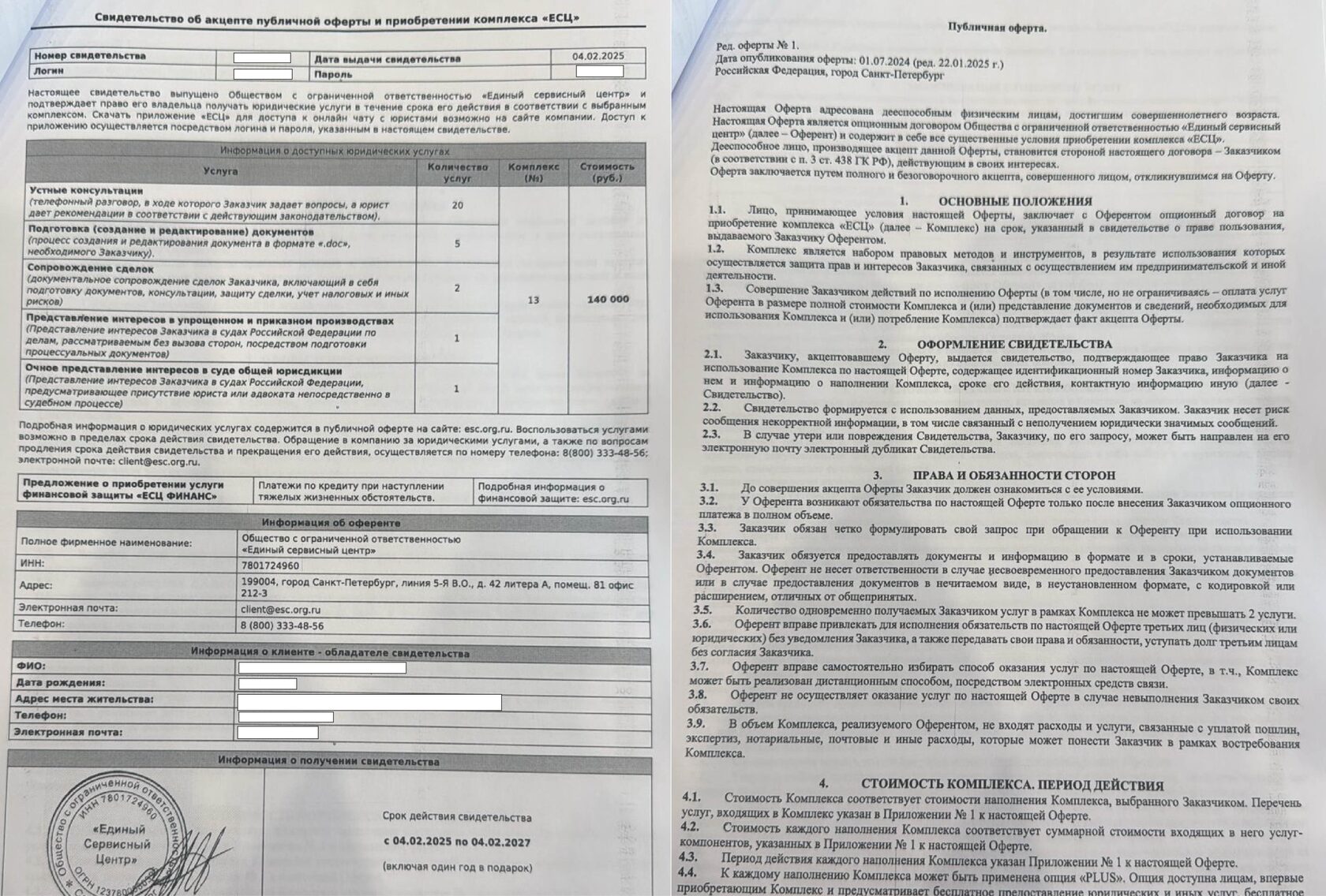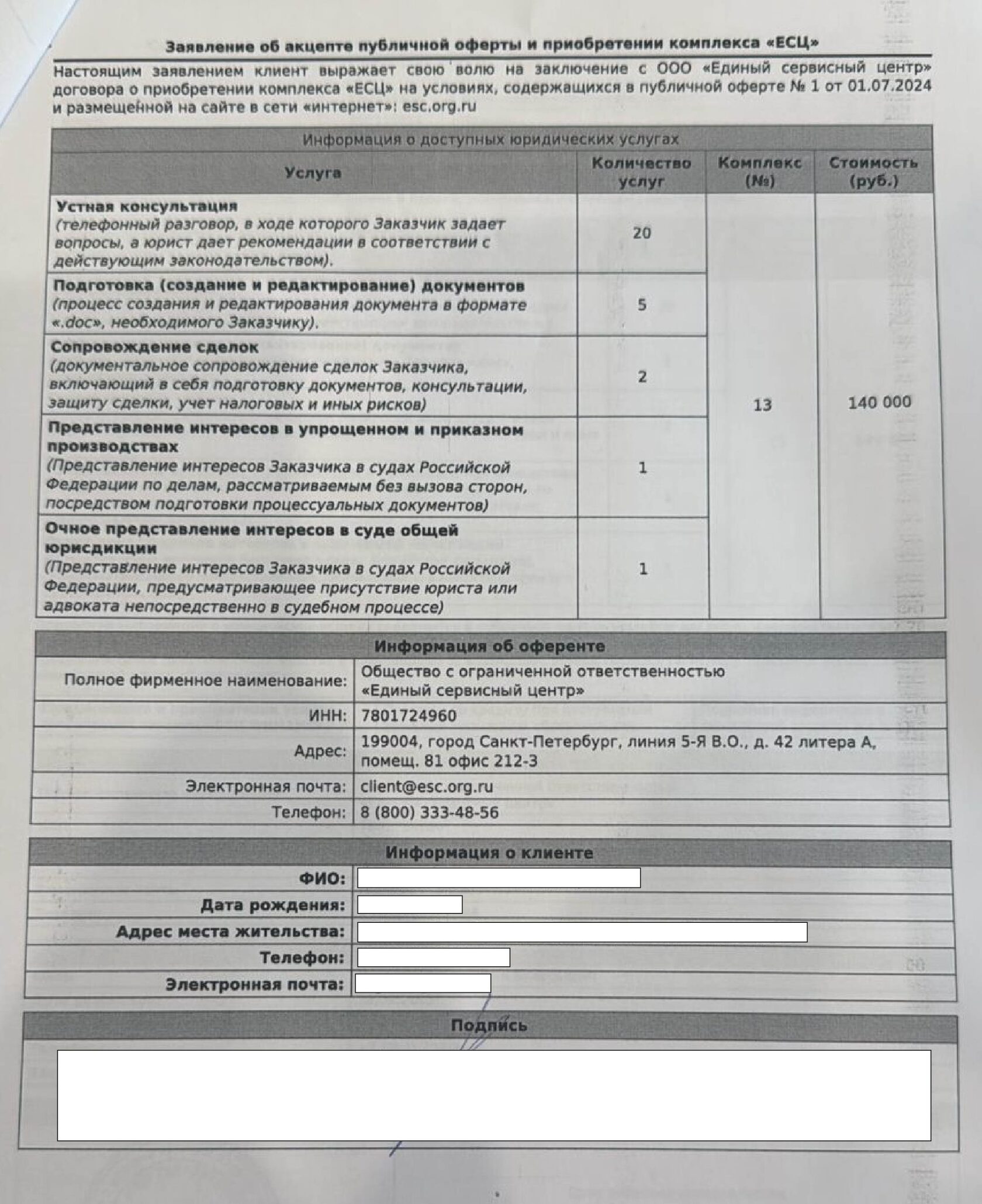 Услуга оформляется путем подписания Заявление об акцепте публичной оферты и приобретения комплекса «ЕСЦ». В нем перечислен перечень услуг. За данный комплекс клиент заплатил 140 000 рублей.