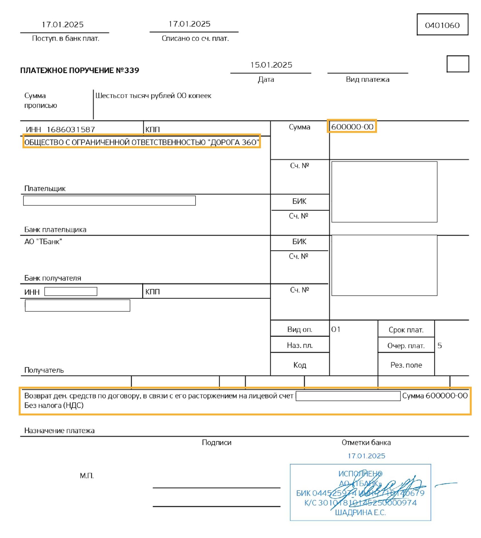 Это действие следует совершить только по истечение 30 дней после направления первичной претензии в ООО «Дорога 360», иначе банк просто не станет рассматривать ваши требования, а вы потеряете время, тем самым усложните процесса возврата денежных средств в полном объеме.